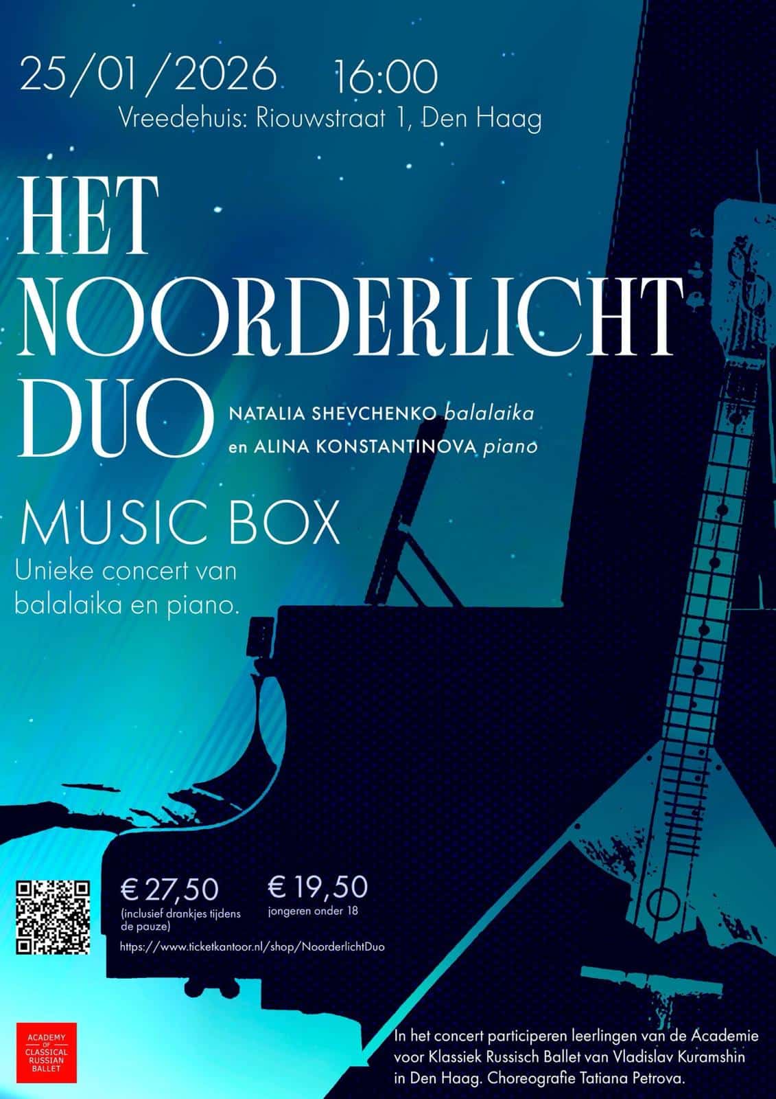 Vreedehuis Riouwstraat 1, Den Haag, Zuid-Holland, NederlandUnieke concert van balalaika en piano. Het Norderlicht Duo Natalia Shevchenko - balalaika Alina Konstantinova -piano Kom genieten van afwisselende en kleurrijke muzikale reis vol virtuositeit, emotie en verrassende klanken. In dit concert hoort u zowel populaire als zelden uitgevoerde klassieke uit de 17e tot en met de 21e eeuw en arrangementen van volksmuziek. Op het…